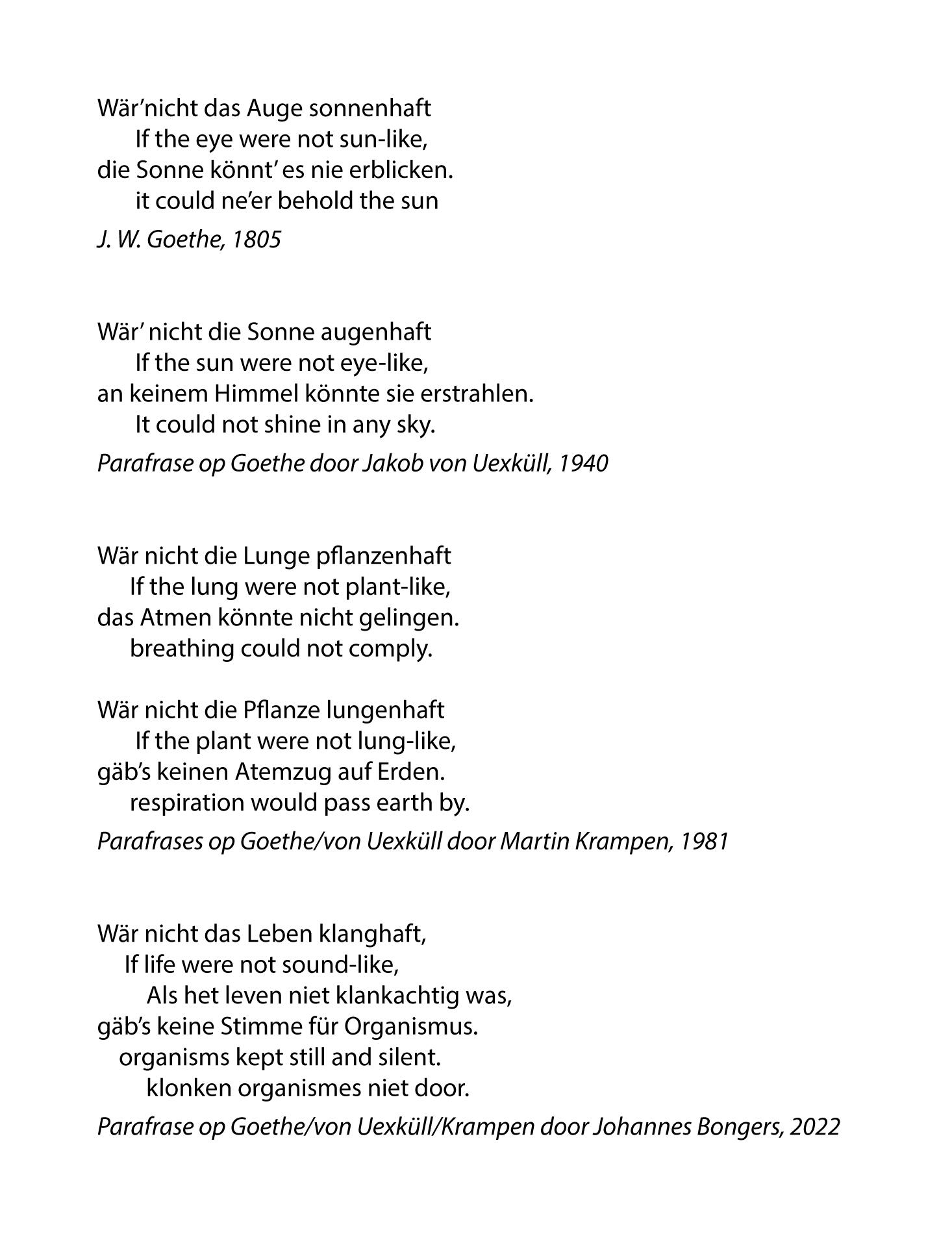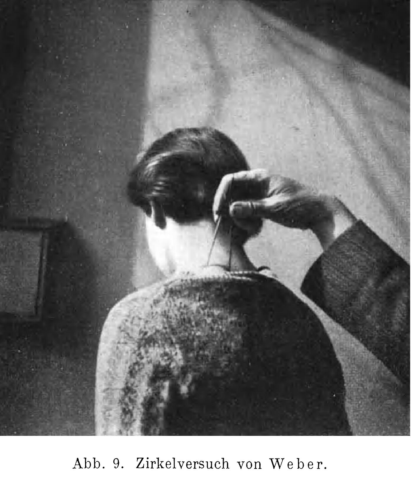 Een oefening voor twee personen. Neem een passer met twee punten, op een afstand van ongeveer 1 tot enkele centimeters en beweeg daarmee, de passer telkens opnieuw plaatsen, van de nek naar beneden langs de schouder naar de rug.Eerst voelen de twee punten als aparte punten maar gaandeweg is er een plek tussen nek en rug waar de punten samenvallen. Op het punt waar tweeën één wordt, ervaar je dat dat er een ergens is, niet alleen als idee, maar als in oord.Von Uexküll spreekt van Merkzeichen, merkteken en dat kan niet misbegrepen worden: de menselijke subjectiviteit draagt op dit punt van het lichaam een merkteken mee.