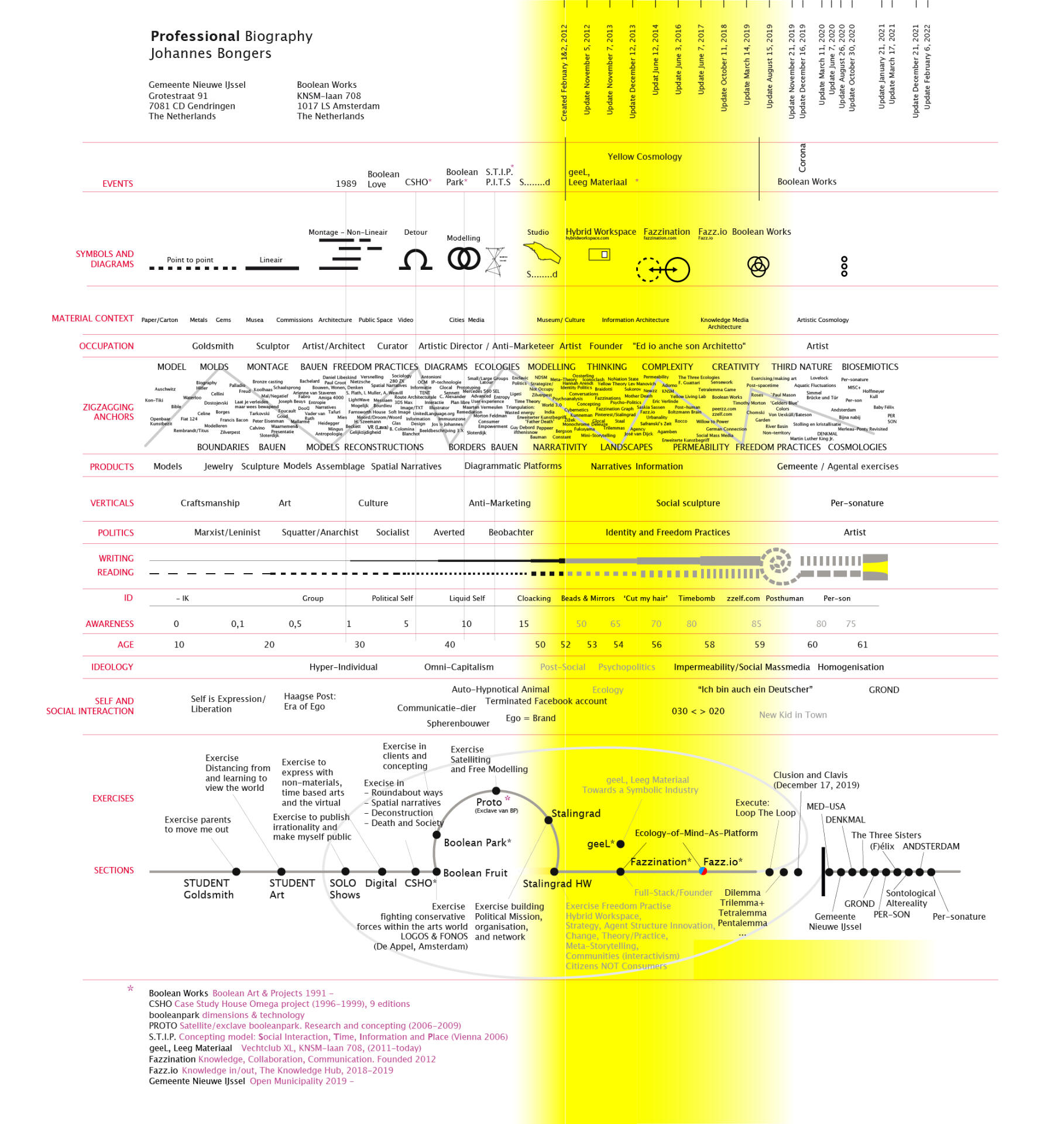 Deze oefening is gebaseerd op een eigen ervaring. We zijn enorm benieuwd naar andere manieren en vormen. Laat van je horen als je hierover iets zou willen delen.Neem een blad, liefst een digitaal blad, plaats bovenaan in het midden een streepje met de datum van vandaag. Som vervolgens aan de linkerzijde een aantal categorieën onder elkaar. Leeftijd, politieke oriëntatie, een balk van links naar rechts waarin belangrijke begrippen en auteurs en anderen los kunnen worden geplaatst. Voeg een lijn toe waarin de grote gebeurtenissen in jouw leven zijn gerangschikt, een lijn met jouw functies, rollen en benamingen, een lijn met je netwerk, een lijn met ... etc.Vul de lijnen in van links naar rechts, tot halverwege de pagina, je hebt de andere helft nodig in de toekomst. Ga iedere 2 maanden terug naar het document en weef langzaam aan de lijnen inhoudelijk in elkaar. Belangrijk: maak de lijnen ten opzichte van elkaar niet kloppend als ze dat in de werkelijkheid ook niet zijn. Daarmee behoud je niet aangeroerd potentieel en verschil dat je later kunt aanboren.*Langzaamaan wordt duidelijk dat je op de ene lijn actiever bent dan op andere, dat je hebt geleerd in een specifiek domein maar stil staat op andere. Denk er iedere twee maanden aan, maak er een levend document van, hoe de verschillende aanzichten van je professionele of persoonlijke leven elkaar kunnen helpen om anders te worden dan ze zouden zijn als je niets zou doen. In dat andere kun je het onaangeroerde potentieel van je leven op een manier naar keuze of verlangen uitwerken en werkelijk maken. **Het mooiste van deze aanpak komt niet vaak voor maar gebeurt regelmatig. Dat je de biografie overziend, door een pijl van de tijd door te trekken voorbij het heden, je ergens een stap kunt nemen in de toekomst, en deze toekomst actief ontwerpt. *