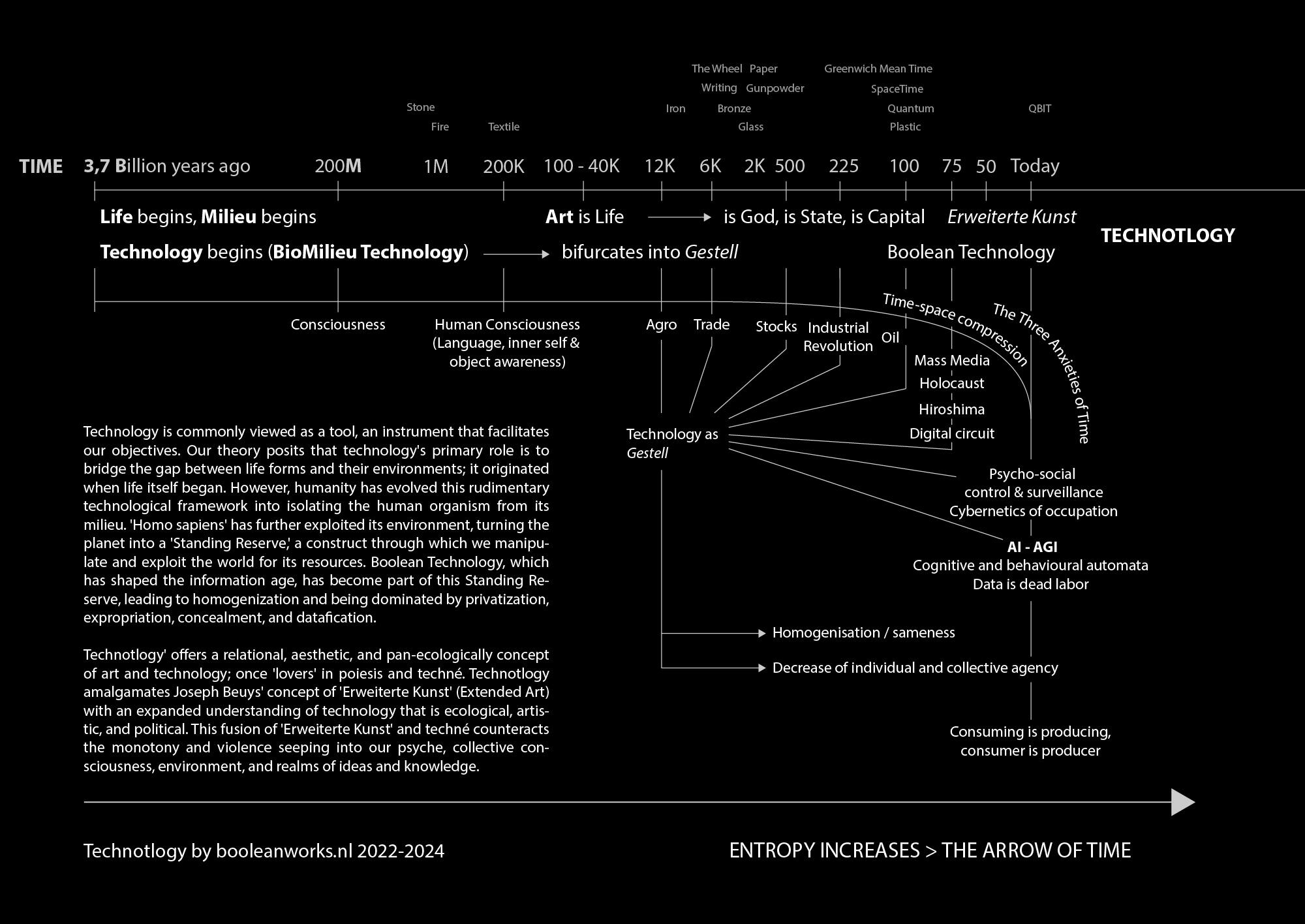 We hebben in de periode 2012-2019 gewerkt aan Fazzination, een tegenverhaal op sociale technologie. Indertijd begrepen we echter onvoldoende dat het niet om het scheppen van andere toepassingen van hetzelfde technologiebegrip gaat maar dat, in de Revolutie der Begrippen, ook het technologiebegrip zelf opnieuw moet worden ontwikkeld.24 november 2022 hebben we Technotlogy geïntroduceerd en 28 November 2023 is het Technotlogy Manifest uitgebracht.Technotlogy verzet zich tegen technologie die in de kern uitsluitend is, die onder het mom van variatie en communicatie bijdraagt aan conflict, uitbuiting en homogenisering.Techniek en kunst putten in het oude Grieks uit elkaars bron, poeisis en techné. Van het verband ertussen, van de liefde tussen hen beide is niets meer over. Van beiden is een nieuw 'uigebreid' begrip nodig, geïnspireerd op het Erweiterte Kunstbegriff van Joseph Beuys.Technotlogy is een antwoord op de belangrijkste bedreigingen veroorzaakt door moderne technologie. De essentie van technologie is om alle energie te onthullen, deze om te zetten in gebruikswaarde en deze te (her) distribueren. Het primitieve voorbeeld daarvan is het agro-industrieel complex, het actuele voorbeeld is hoe technologie individuele en sociale energie oogst, opslaat en doorverkoopt, het ultieme voorbeeld ervan vormt AI. Deze oogst alle menselijke creativiteit en her-distribueert deze om er nieuwe waarde uit te kunnen destilleren. Uiteindelijk zal het menselijk 'zijnde' een product van deze technologie worden.